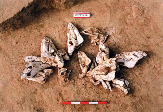 兴隆沟遗址5号房址西南部成组兽头。包括12个猪头和3个鹿头。兽头前额多数有人工开孔。