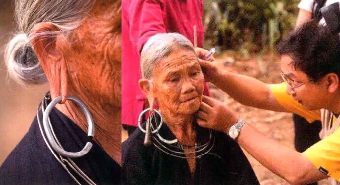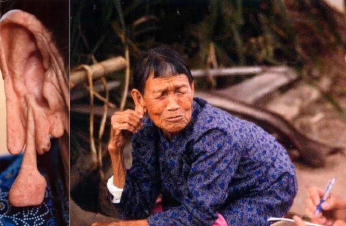 海南乐东保定村王色开女士耳垂。耳垂及肩,三次被拉断。二十一世纪初的海南黎族,仍留下我国最后一代耳垂状似鸡肠的女性。