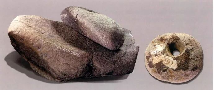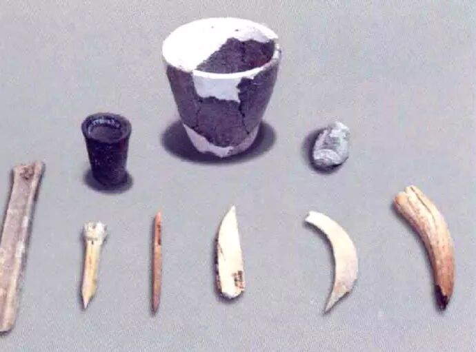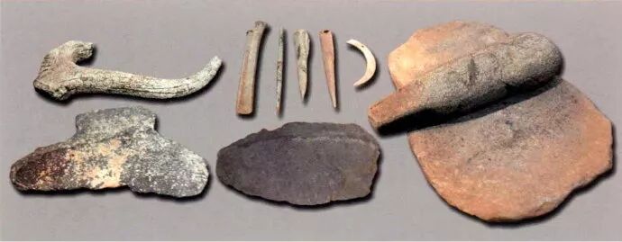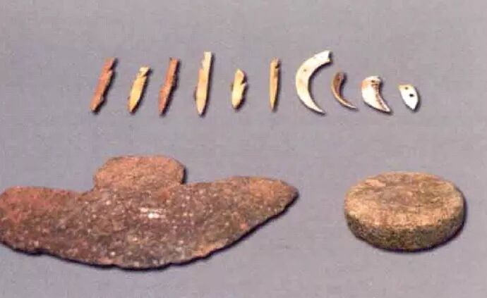 兴隆洼遗址第一期遗物:石磨盘、石磨棒、石产、石刀、鹿角、骨匕、骨锥及牙器。