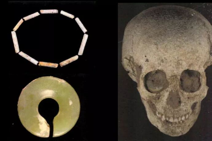 四号墓小女孩的头骨,她的项圈和她戴的耳环。不知什么原因,一只耳环(玉玦)掉进了头骨的眼窝之中。出土时,头骨是竖放着的。