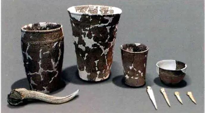 兴隆沟遗址第一地点A区出土陶罐、陶钵、陶杯、鹿角及骨锥。