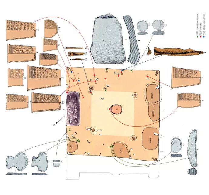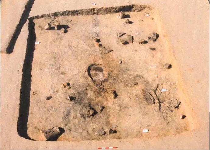 距今约8000年前,我国东北及俄罗斯东南部一带,均流行平底筒形罐与半地穴居住房址的组合,其中以兴隆洼文化中心性聚落的规模最为宏大。图为兴隆沟第一地点东区10号半地穴房址及出土平底陶器群。