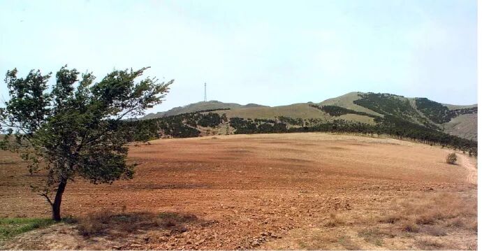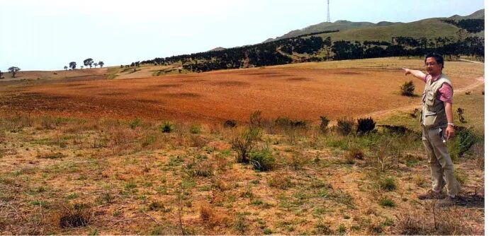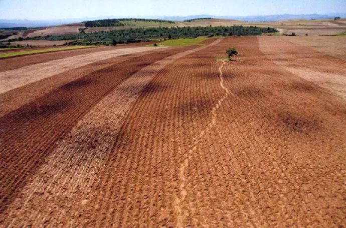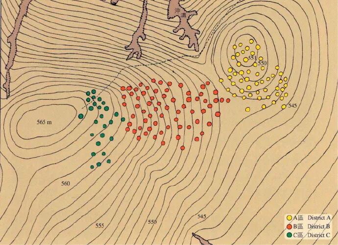 遗址从地表可观察到房址灰圈遗迹(图中灰暗的部分。北——南)
