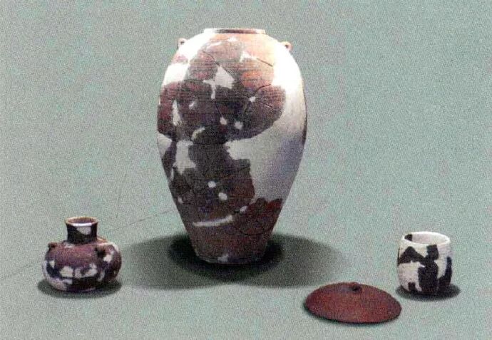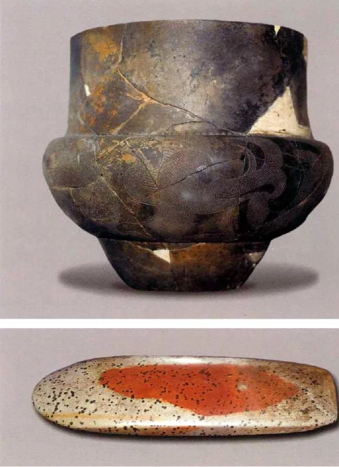 兴隆洼遗址第二地点出土红山文化第四期三系彩陶壶、彩陶雍、器盖及彩陶罐。
