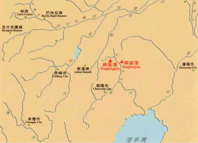 兴隆洼和兴隆沟遗址的位置。兴隆洼聚落遗址位于内蒙古赤峰市敖汉旗东部,地处大凌河支流牤牛河上游右岸。1983年至1993年,先后进行过6次发掘,揭露总面积三万余平方米,共清理出半地穴式房址180余座,灰坑400余座、居室墓葬30余座,同时出土了一批重要的陶器、石器、玉器、骨器、蚌器以及兽骨、人骨、植物遗骸资料等,由此正式提出了“兴隆洼文化”的命名(年代为8200——7200年)。兴隆洼聚落是迄今所知中国第一个完整揭露出房址、灰坑和围壕等全部居住性遗迹的史前聚落。