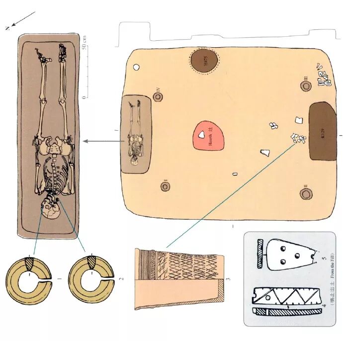 兴隆洼遗址176号房址内埋入117号墓。墓主人两耳侧出土玉玦一对。填土内有条状蚌饰和人面形蚌饰。