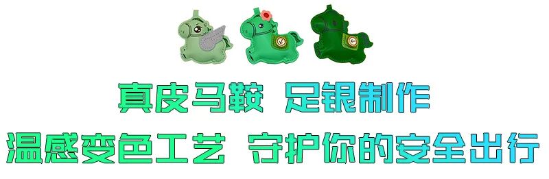 马背上镶嵌1.5g纯银箭头通行标志,可温感变色,也可旋转,设计精美,寓意马上平安、马上通行、马到成功。