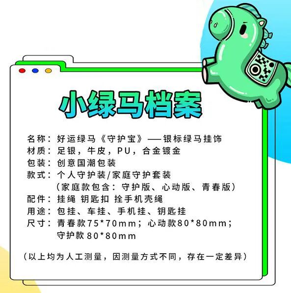 今天就给大家带来一匹神奇的小绿马——好运绿马·守护宝银标挂饰,好看好玩又实用!