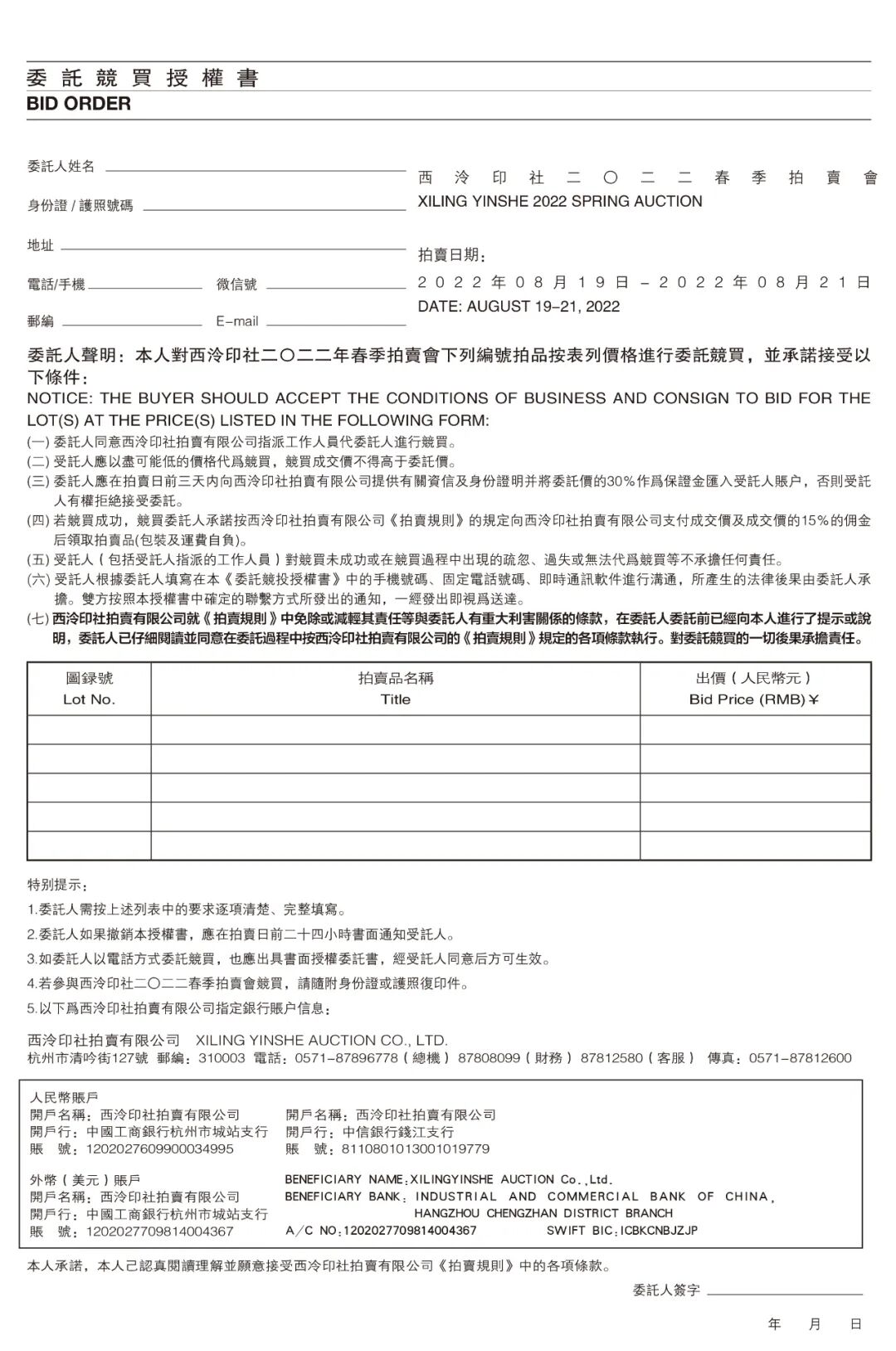 ■ 西泠印社拍卖有限公司举办的拍卖活动均依据本图录中所附之《拍卖规则》进行,竞买人在竞买活动中表明,已仔细阅读并同意在竞买过程中按照西泠印社拍卖有限公司的《拍卖规则》规定的各项条款执行,对竞买过程及结果承担一切法律责任。