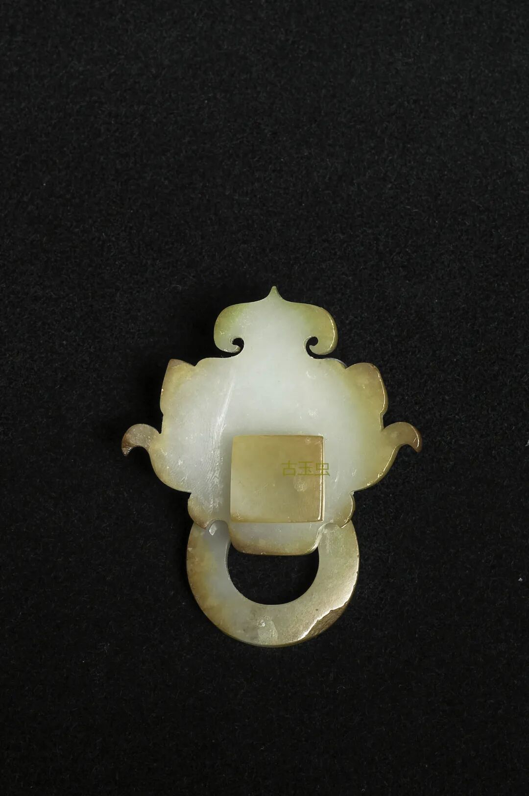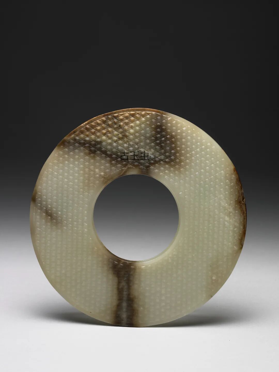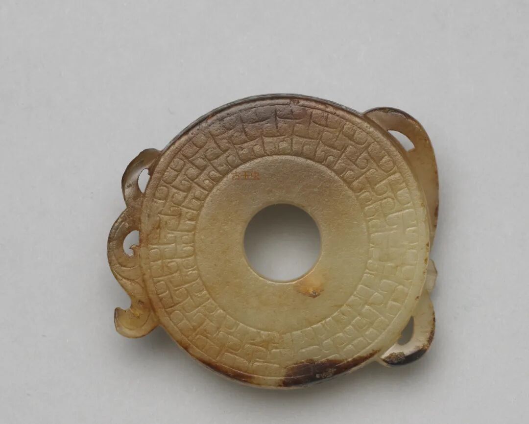 青玉泛黄,有赭斑,表面多处白沁。尚有玻璃光,琢作S 形龙,谷纹排列规整。上缘刻一「百」字。