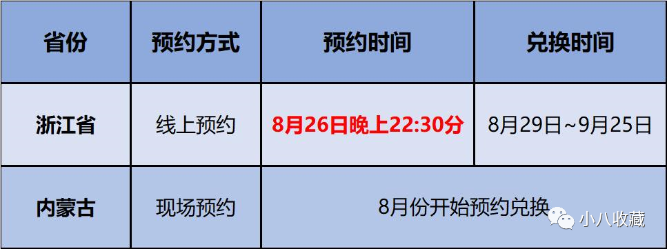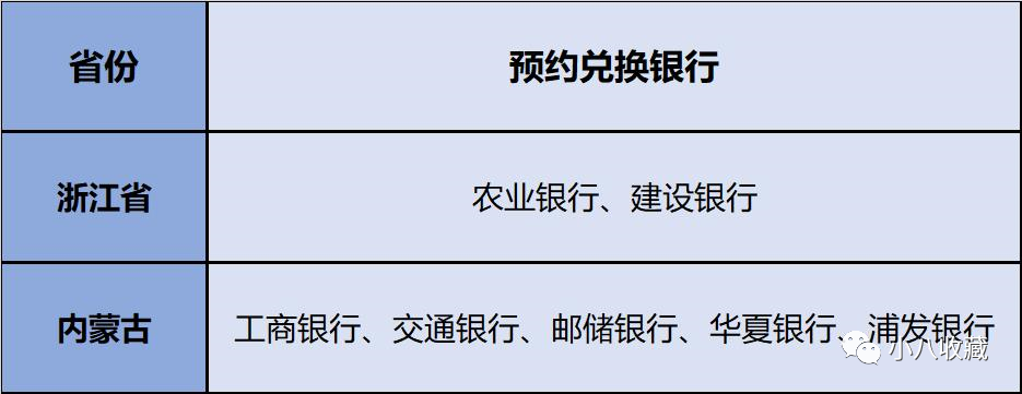 目前只有浙江和内蒙古公布了预约兑换银行,其它地区还未公布,公布后,我们会及时给大家更新。
