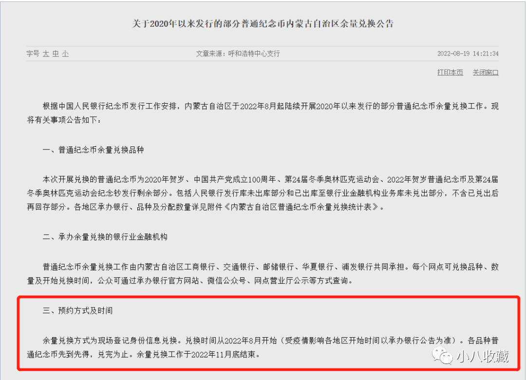 昨天,中国人民银行内蒙古分行发布公告,内蒙古地区的虎年纪念币将于8月份开始进行现场预约兑换!