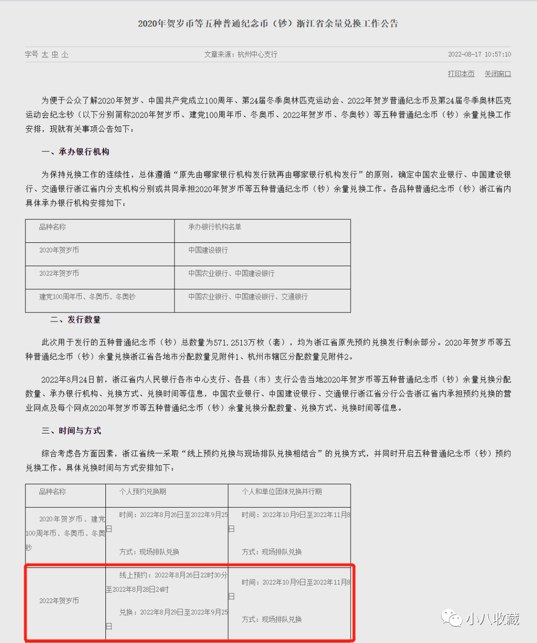 前几天,中国人民银行浙江分行发布公告,浙江地区的虎年纪念币二次预约将于8月26日晚上22:30分在线上开始预约。