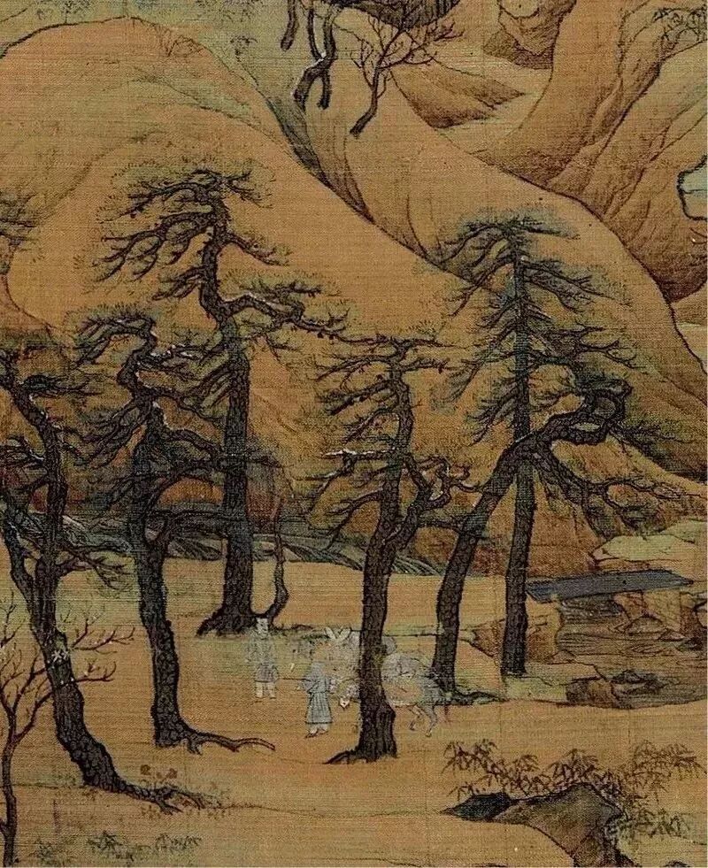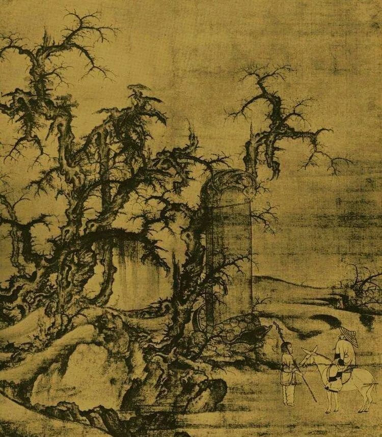 《读碑窠石图》为双拼绢绘制的大幅山水画,表现冬日田野上,一位骑骡的老人正停驻在一座古碑前观看碑文,近处陂陀上 生长着木叶尽脱的寒树……