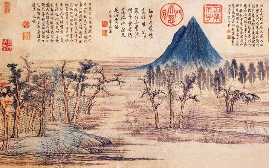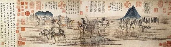 《鹊华秋色图》不愧是一幅名画:长汀层迭,渔舟出没,林木村舍掩映,平原上两山突起;林木红绿相间,枯润相杂,树姿高低变化丰富,疏朗有致;房舍人畜、芦荻舟网均精描细点,诸多景物安排错落有致。这幅图在元、明两朝一直收藏于民间,到了清朝,被收入皇宫,成了乾隆皇帝心爱的宝贝,乾隆亲笔以大字“鹊华秋色”题于引首,题跋九则,钤印众多。