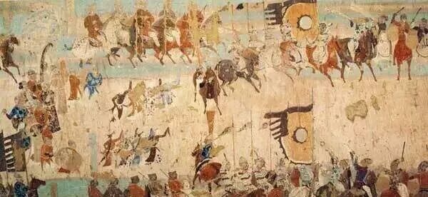 《张议潮统军出行图》在中国美术史中是一幅非常著名的“出行”作品,它不仅有较高的艺术价值,而且还有极高的史料价值,是一幅珍贵的历史画卷。《张议潮统军出行图》描绘的是唐朝敦煌地区最高统治者张议潮接受唐朝廷敕封为河西节度使后统军出行的浩大场面。此图绘于敦煌156窟的南壁和与南壁相接的部分东壁之上,性质是供养画出行图。