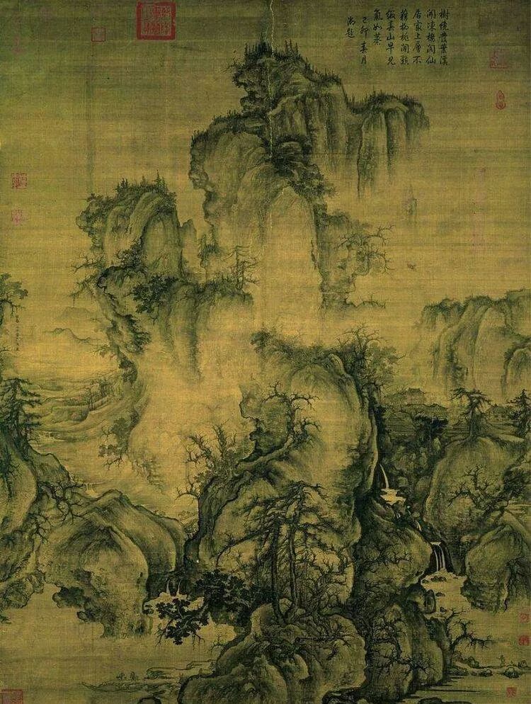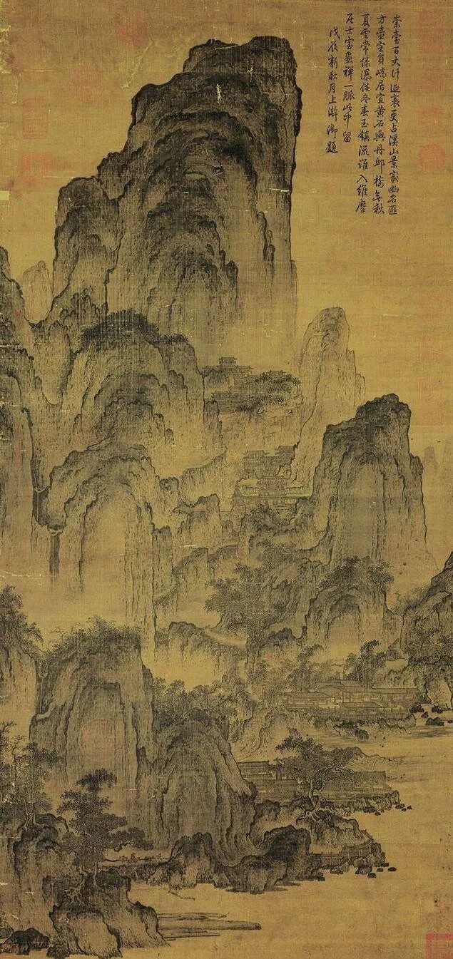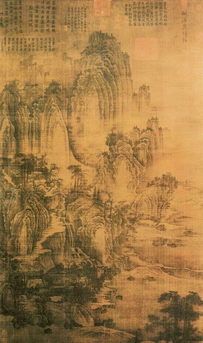 《庐山高图》是明代杰出画家沈周41岁时为祝贺老师陈宽70岁寿辰的精心之作,此画仿王蒙笔法,图中山峦层叠,草木繁茂,气势恢弘。现藏于台北故宫博物院。