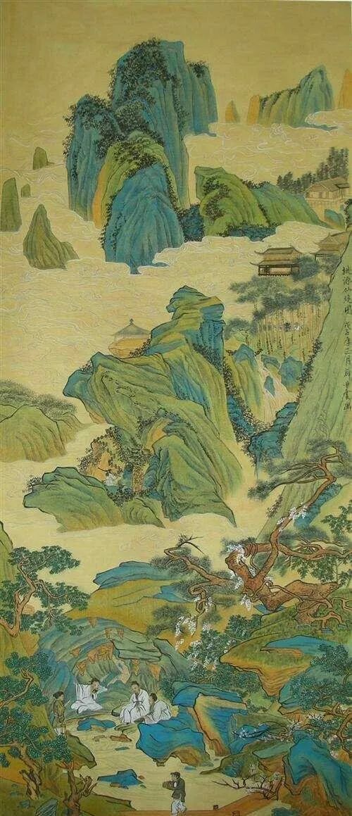 仇英此《桃源仙境图》描绘远处峰峦起伏,幽深高远,山间云蒸雾漫,远山深处庙台亭阁在云雾中时隐时现,若仙若幻。前景是流水木桥,奇松虬曲,景致幽雅。在艺术表现上,画家勾勒精工,不论一草一木,一枝一叶,还是人物的动态和表情都描绘的细致入微,严谨工细。通幅青绿着色,色彩妍丽雅美。显示了仇英精深的人物和山水表现能力。