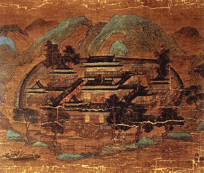 《江帆楼阁图》为立轴绢本,为唐代李思训画作,青绿设色,纵101.9厘米,横54.7厘米,现存宋人摹本,藏于台北故宫博物院。