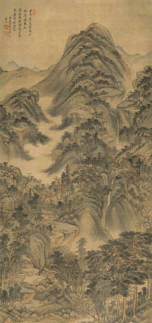 南山积翠图 立轴 设色纸本 1642年作 款识:空山寂寂罨遥青,石作屏风树作扃。昼永幽人无个事,餐芝饮涧读黄庭。壬午九秋仿子久南山积翠图,奉祝汇翁年先生七十大寿并题请正。……