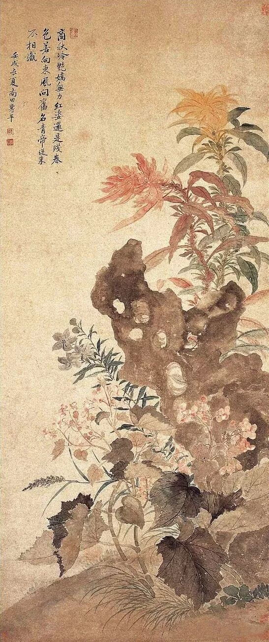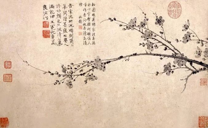 墨梅图轴为元代王冕的书画作品。现收藏于上海博物馆。这一幅“墨梅图”是繁花的代表作。此图作倒挂梅。枝条茂密,前后错落。枝头缀满繁密的梅花,或含苞欲放,或绽瓣盛开,或残英点点。正侧偃仰,千姿百态,犹如万斛玉珠撒落在银枝上。白洁的花朵与铁骨铮铮的干枝相映照,清气袭人,深得梅花清韵。