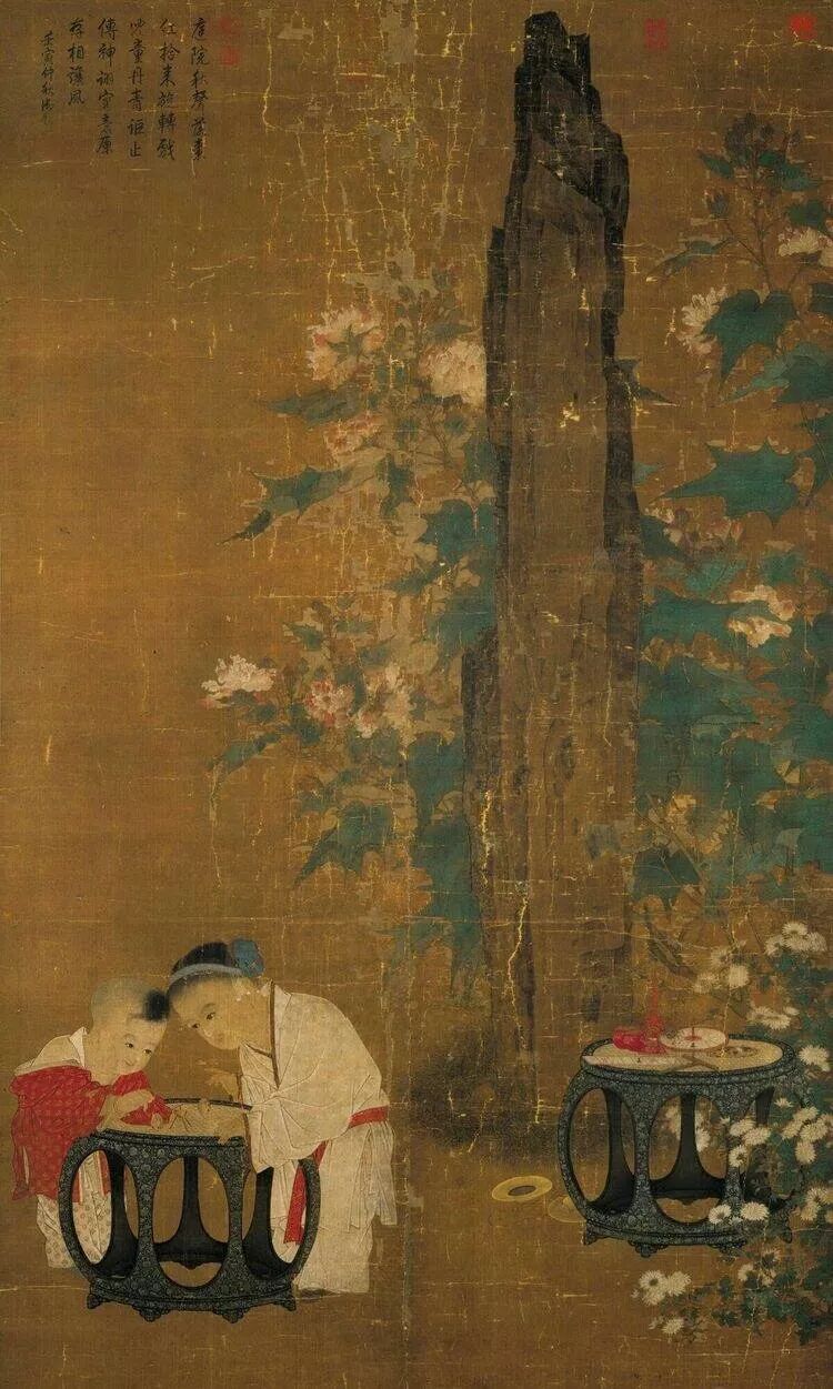 秋庭戏婴图”以细腻的笔法,描绘两个锦衣孩童在庭院玩着一种推枣磨的游戏。兄妹两人无论从头发、眉目,衣饰,都精心刻画,丝染兼备,而且变化极为丰富,以长而圆润的线条,画出衣纹,再仔细点染衣服上的花纹,不仅画出质料的柔软细致,更赋予衣服华丽的质感,这些细微的处理,使得子孩丰润、柔软、细致的模样,跃然于纸上……