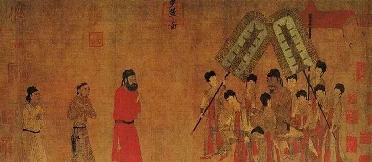 步辇图》所绘是禄东赞朝见唐太宗时的场景。现存画作被认为是宋朝摹本。存于北京故宫博物院。绢本,设色,纵38.5厘米,横129.6厘米。