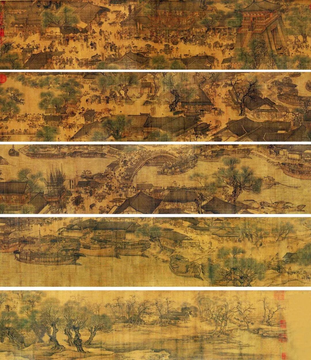 图宽25.2厘米,长528.7厘米,绢本设色。作品以长卷形式,采用散点透视构图法,生动记录了中国十二世纪北宋汴京的城市面貌和当时社会各阶层人民的生活状况。是汴京当年繁荣的见证,也是北宋城市经济情况的写照。在五米多长的画卷里,共绘了814个各色人物,牛、骡、驴等牲畜73匹,车、轿二十多辆,大小船只二十九艘。房屋、桥梁、城楼等各有特色,体现了宋代建筑的特征,具有很高的历史价值和艺术价值。
