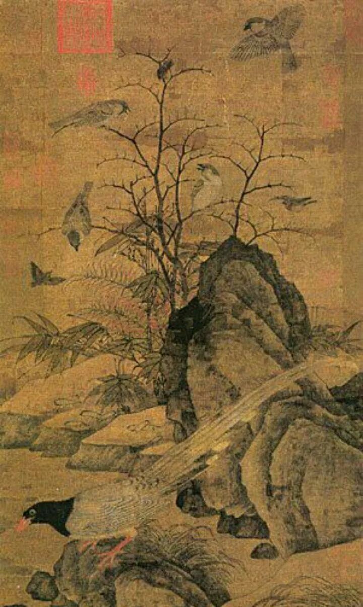 《山鹧棘雀图》是花鸟画名家黄筌的之子黄居寀所创作,收藏于台北故宫博物院。此画中的鸟鹊与竹石,布满画面,空白很少。设色淳厚无华,描法稳健,略带稚拙之感,有着早期花鸟画的装饰意味,及古朴风韵。