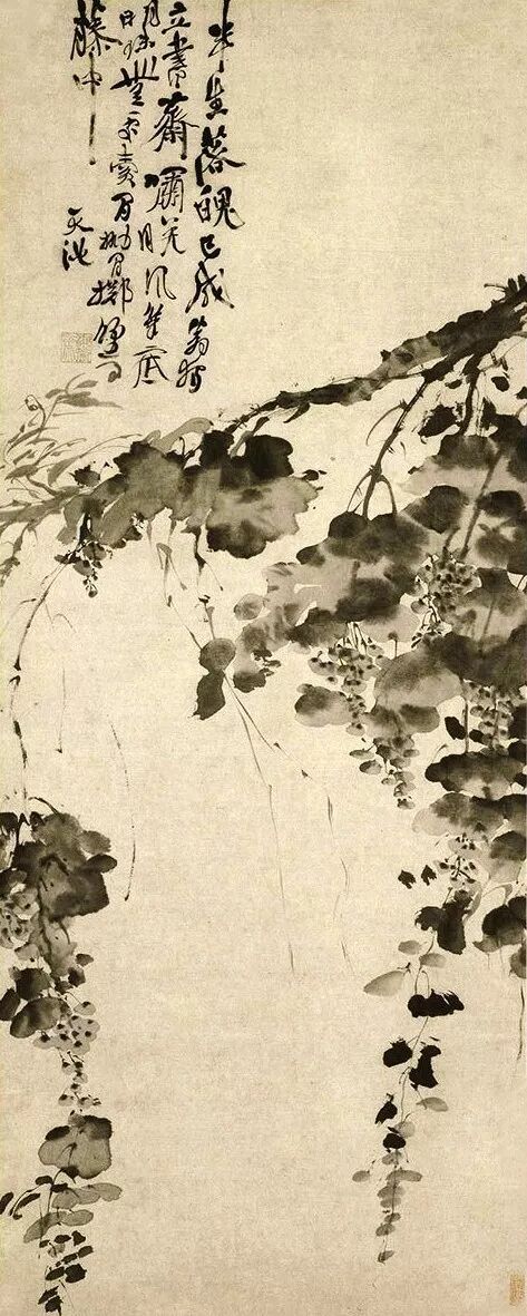 水墨葡萄一枝,串串果实倒挂枝头,水鲜嫩欲滴,形象生动。茂盛的叶子以大块水墨点成。风格疏放,不法语形似,代表了徐渭大写意花卉的风格,也是明代写意花卉高水平的杰作《葡萄图》作 者:徐渭 创作时间:明