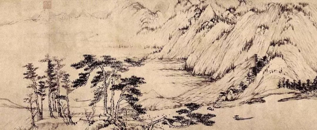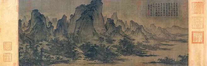 《溪山清远图》是夏圭的传世佳作,纸本长卷,墨色,纵46.5厘米,横889.1厘米。《溪山清远图》描绘的是山色空蒙、水光潋滟的清远秀丽的景色。画面从雾景开始,近处的巨崖大石清晰可见。一片茂盛的松林在阳光之下茁壮成长,密林深处的楼阁院落若隐若现,院前有小桥流水和往来行人。