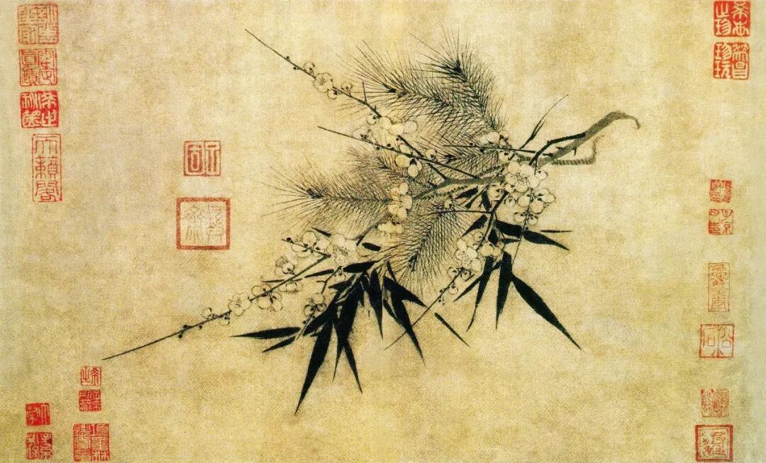 画中的梅花以淡墨衬染着用细笔,浓墨所圈钩的花瓣、松针用笔尖挺劲拔,墨竹以中锋运使,挺劲有力。松、竹、梅画法各异,充满韵致,是幅极具精神的南宋小品。赵孟坚的作品一笔一画都注意书法与画法的结合,可以代表宋末文人画的艺术特色。