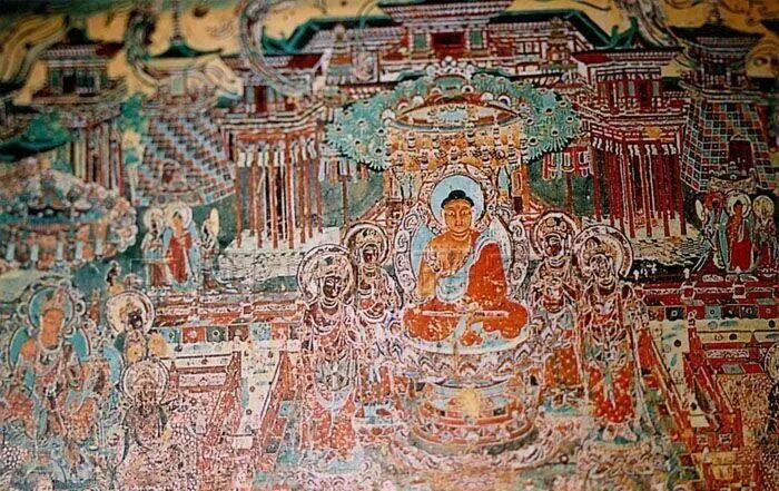 《西方净土变》是唐代的敦煌壁画中的一壁。这一场面恢宏,色彩绚烂的佛国景象,是宗教美术依据《无量寿经》内容,为信众们构想出来的《西方净土变》,也就是人们常说的西方极乐世界。