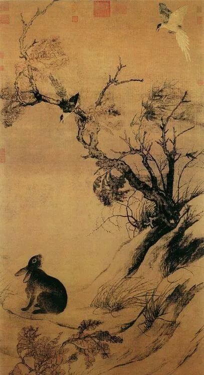 《双喜图》是一幅情景交融的佳作。可见宋人的写实,并非只是简单地写形、求真,而是通过对形的细微刻画以营造出一种特定的意境。画面以扣人心弦之情节抓住观者,无论是腾空展翅还是雀跃枝头的二鹊与树下玄兔都为不期而遇在秋风中各显其态,古木槎栎与随风摇曳的翠竹有机结合。章法开阔、布置运迷入疏,而细者不滞物态,秀挺用力的调笔恰到好处地塑造出不同质地的物态。