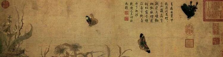 《写生蛱蝶图》年代:宋 ,作者:赵昌,纸本、设色,大小:纵27.7厘米,横91厘米。收藏于北京故宫博物院。