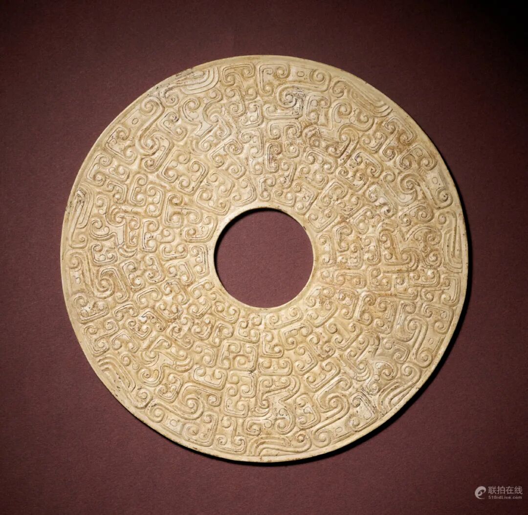 拍品估价:300,000 - 500,000 港币此璧玉质已全部白化,呈白褐色,中孔较小,内外有边框,通体纹饰由浅浮雕七组龙纹和云纹交错组成,每组龙纹由回头龙首、尾部、前爪、后足构成。整体设计看似繁复,却井然有序。此璧纹饰恰由七组龙纹组成,是否和稍晚战国中期形成七雄争胜的局面有所关联或只是时空的巧合,值得玩味。琢饰类似抽象龙纹的玉璧另可参考两件,尺寸皆较小,一件(12.5公分)载于《春秋玉器》,台北,2010年,图版28号;另一件龙纹五官肢体更抽象的玉璧(15公分)于湖北省随州市曾侯乙墓出土,着录于《中国考古文物之美5:战国地下乐宫》,北京,页144。