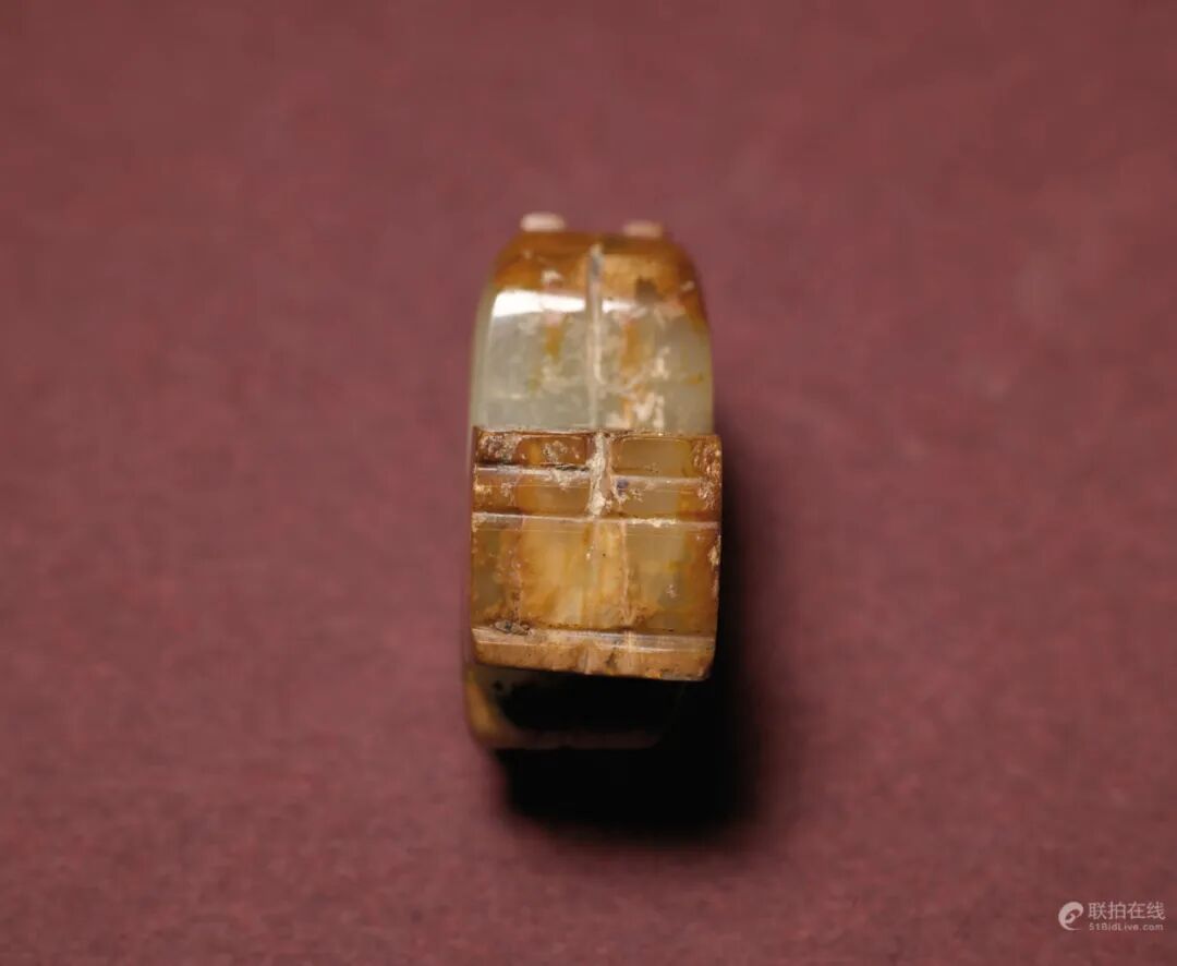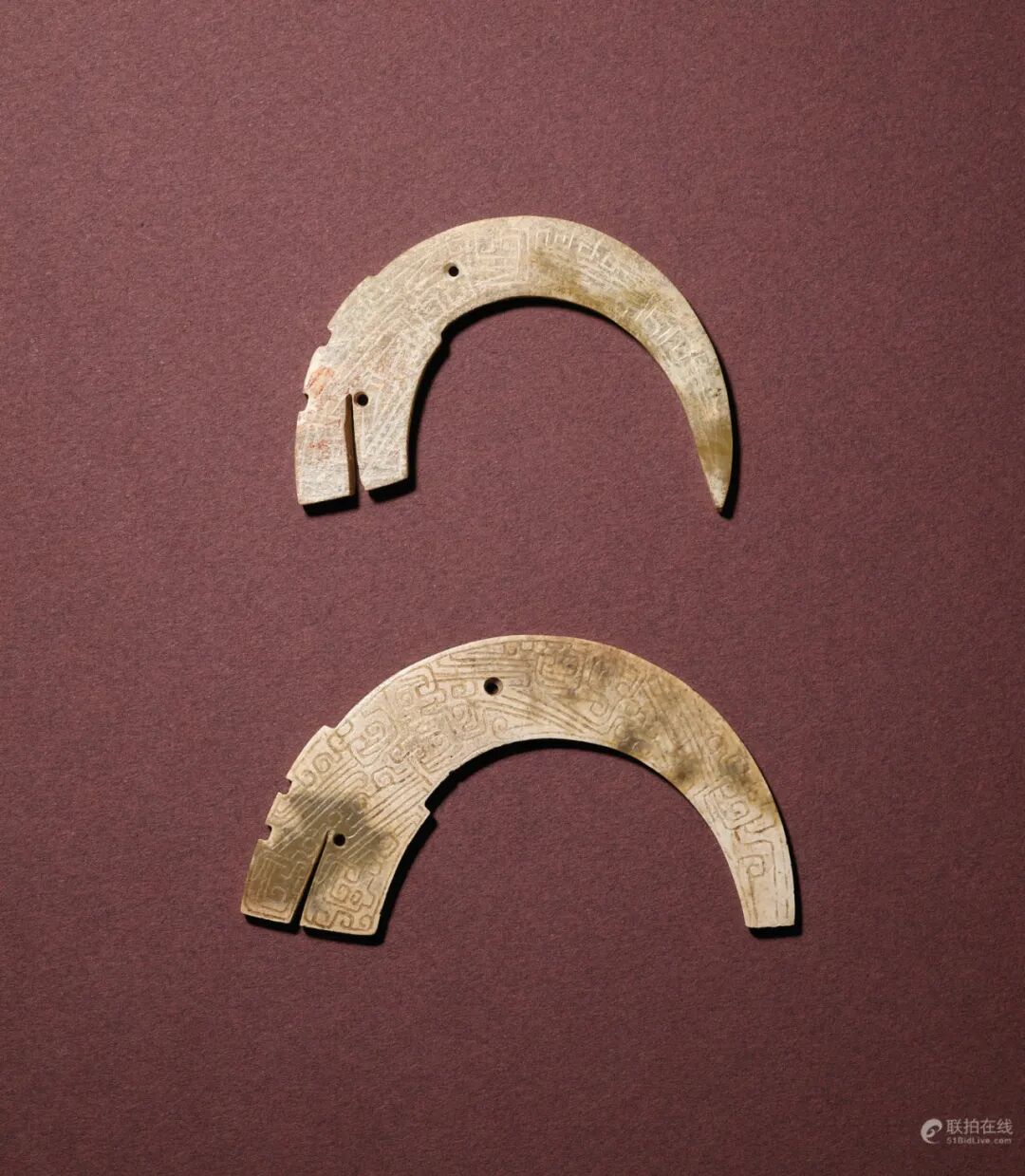 拍品估价:100,000 - 150,000 港币方形龙首头顶有两突齿,口缝细而深,口角边钻一圆孔,背部略靠前处亦钻一圆孔,器身两沿切成斜边,两面皆以细线阴刻秦式龙首纹及变体秦式龙纹,隐见冠毛龙角。此组拍品器型及纹饰与1986年陕西省凤翔县南指挥村秦公一号墓出土两例相似,见刘云辉编著《陕西出土东周玉器》,北京,2006年,108页,图版FN77及FN78。