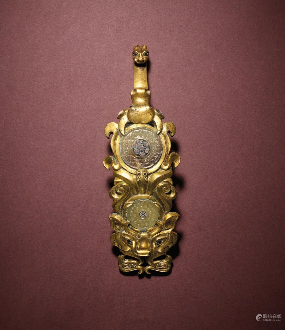 Lot 2771 战国晚期 鎏金镶嵌玉璧琉璃珠龙首牛头兽面铜带钩拍品估价:600,000 - 800,000 港币此件带钩为复合式工艺,技术繁复,难度极高。器身鎏金,均匀饱满,钩首所雕之龙首,从钩颈所雕之牛首嘴中伸出,极具巧思;钩体宽大,钩面至钩尾雕各式兽面纹,钩面上的大小两圆形开光,各镶嵌一块谷纹璧,大璧中央镶嵌七颗蓝色琉璃珠,小璧中间镶有一颗,全器宏伟大度,气势逼人,颇具王者气象。可比较一同以复合式工艺打造的鎏金银嵌玉璧料珠龙纹带钩,见Eskenazi,《Inlaid Bronze and Related Material form Pre-Tang China》,1991年6月,图版48号。