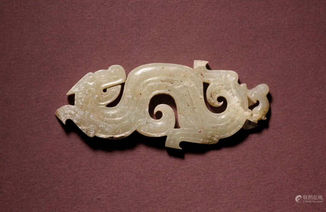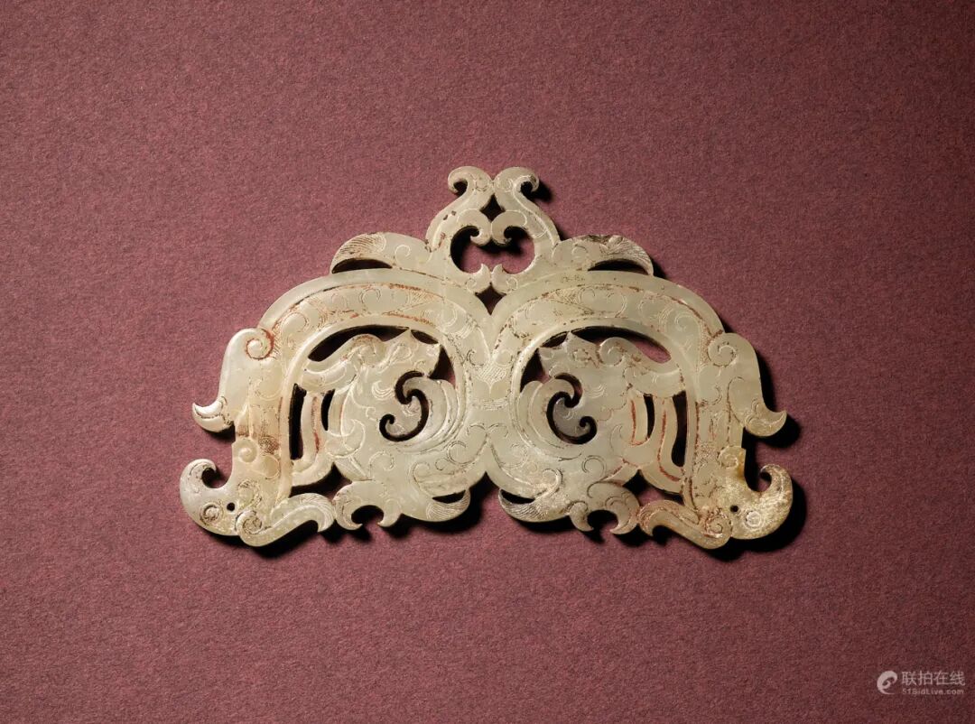 拍品估价:800,000 - 1,200,000 港币此珮作双龙首形,口部透雕,尖唇,杏仁目,独角。中部上缘透雕相背双凤纹,下缘透雕云纹,雕工十分细致。参考一件山东省淄博市临淄区商王村1号墓出土的造型类似的玉双龙凤出廓璜,其身躯较粗,上下缘出廓处分透雕云纹及螭纹,见《中国出土玉器全集-4-山东》,北京,2005年,图版192号。