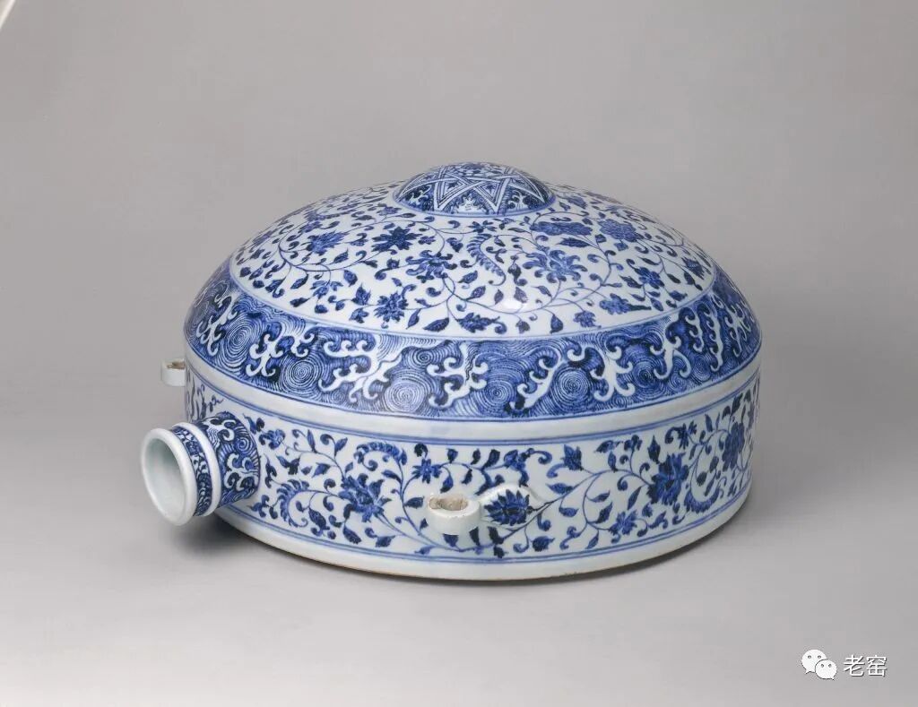 梨壶,壶身为梨形,弯流曲把,矮圈足。永乐时青花梨壶矮颈,圆腹,弯流,曲把,尖顶盖,圈足稍高。成化时器身较前期略长。