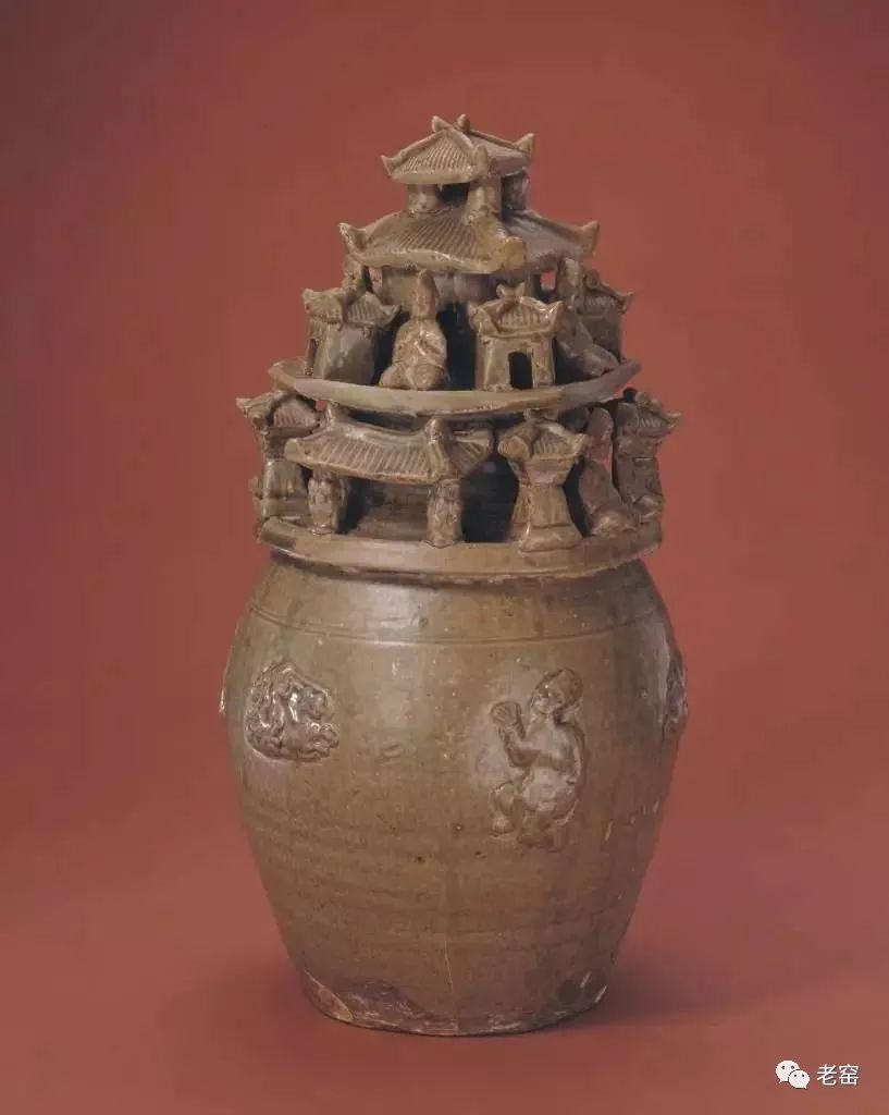 谷仓,一种陪葬物。下部为罐形,上部堆塑楼阁、人物、家畜、粮仓等,故名。三国至东晋时期浙江地区烧制,多为青釉。