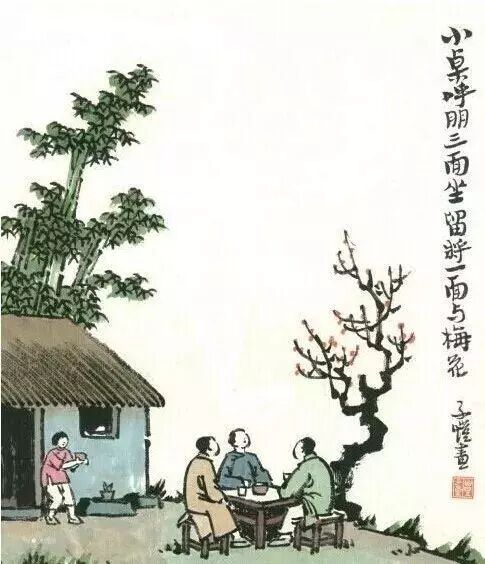三位好友,小院闲坐,大家品茗闲话,且留一个位置与小院盛开的梅花,着实雅事。