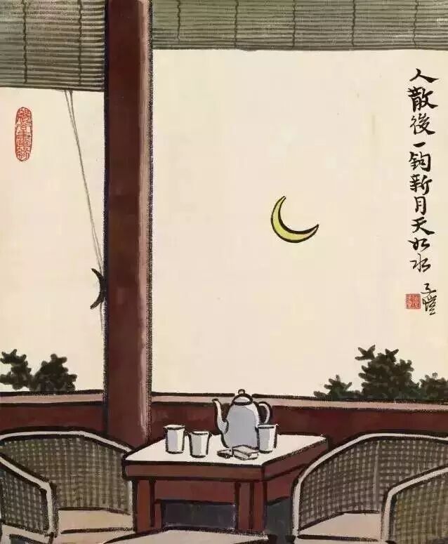 窗外新月如钩,室内茶杯几只,人的一生,遇上过多少个一钩新月天如水的夜?人走了茶香和余温久久袅绕、依稀尚存。就在刚才,主人与客相谈甚欢,可能是良朋对酌,说尽傻话痴语;可能是海棠结社,行过酒令填了新词;可能是结队浪游,让哄笑惊起宿鸟,碎了花影。明知道天下没有不散的宴席,可人散后,竟还是会有几分落寞与怅然。