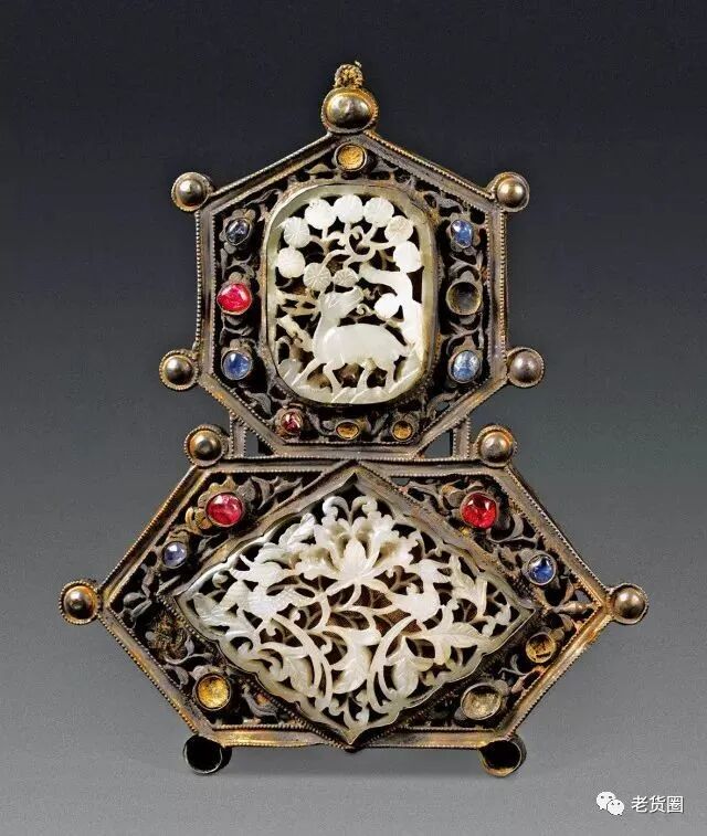 银鎏金嵌宝镶白玉松鹿绶带鸟牡丹纹帔坠。