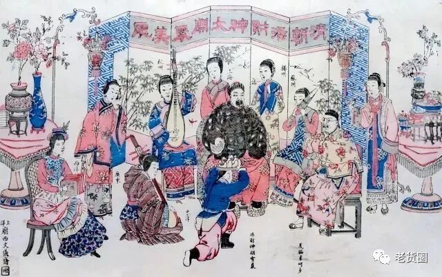 清朝活财神大开聚美厅,上海旧校场年画。此画描绘的是事业如日中天的胡雪岩端坐聚美厅,旁有江南各地乃至东西洋女子为其吹拉弹唱的情景。