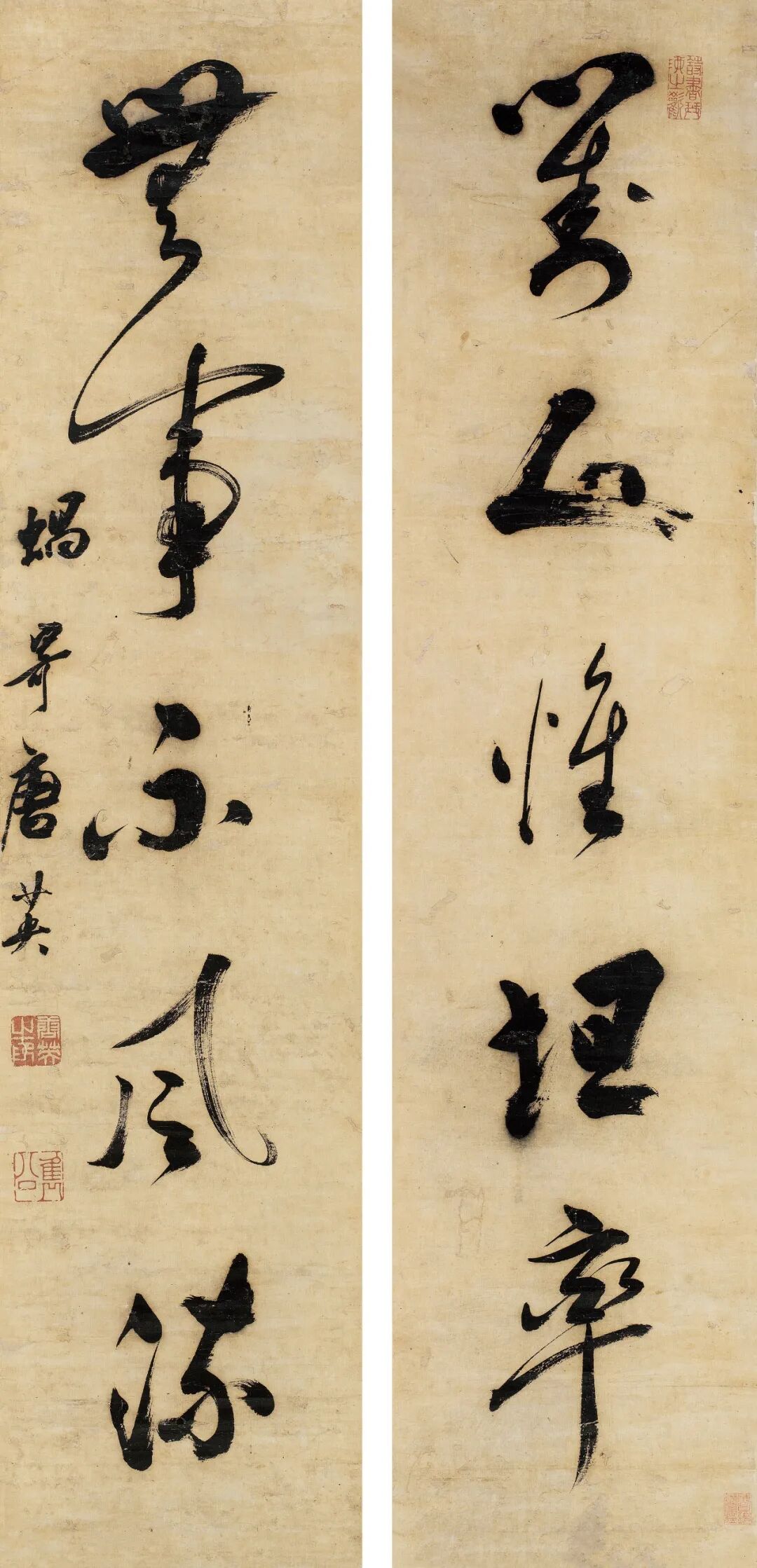 唐英因在景德镇御窑厂历史中,督陶时间最长、成绩最著而被称为“前无古人,后无来者”的督陶官。他在所制的瓷器上,将字画雕刻与陶艺巧妙地结合起来,两者相得益彰,富有文人墨宝的情趣。沈故宫博物院藏有唐英《行书十四言联》。本幅唐英是由钱镜塘薮青草堂旧藏,行书书风,仿黄山谷中宫敛结,长笔四展,欹侧变化,不受羁束,与其书写内容一样“坦率”而“风流”。而最终为景德镇唐英学社成功竞拍,为唐英研究的文化传承再添新篇。