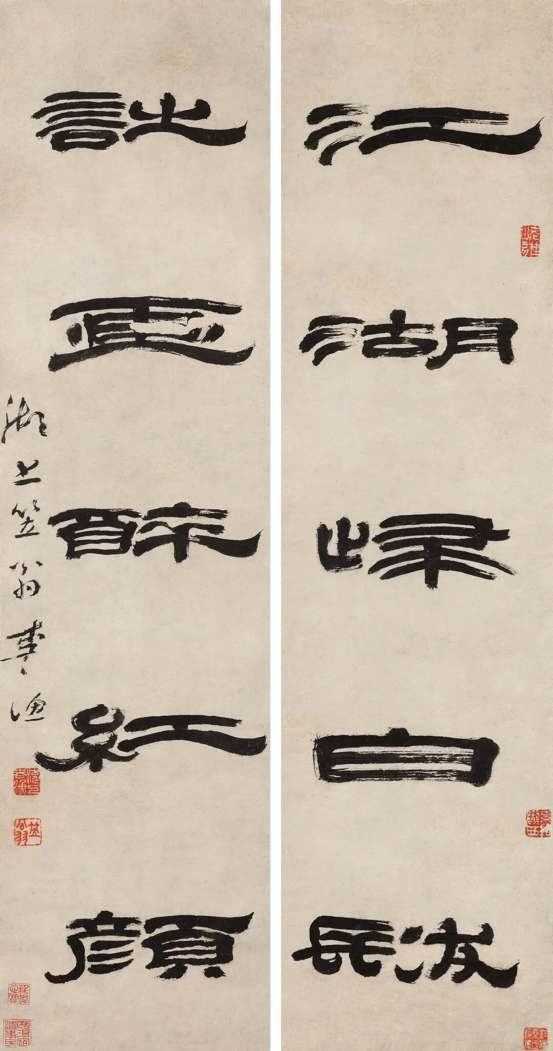 “江湖归白发,诗画醉红颜”,本幅隶书五言联,是清代著名文学家、戏剧家、戏剧理论学家、美学家李渔的臻品。李渔(1611-1680),移家金陵(今江苏南京),筑“芥子园”别业,并开设书铺,编刻图籍。创立了较为完善的戏剧理论体系,成为休闲文化的倡导者、文化产业的先行者。其戏曲论著《闲情偶寄》,对中国古代戏曲理论有较大的丰富和发展。另改定《金瓶梅》,倡编《芥子园画传》等。本幅对联是近代著名书法篆刻家桑宝松、原江苏省宣传部部长陶白递藏,并且由陶白先生家属提供。