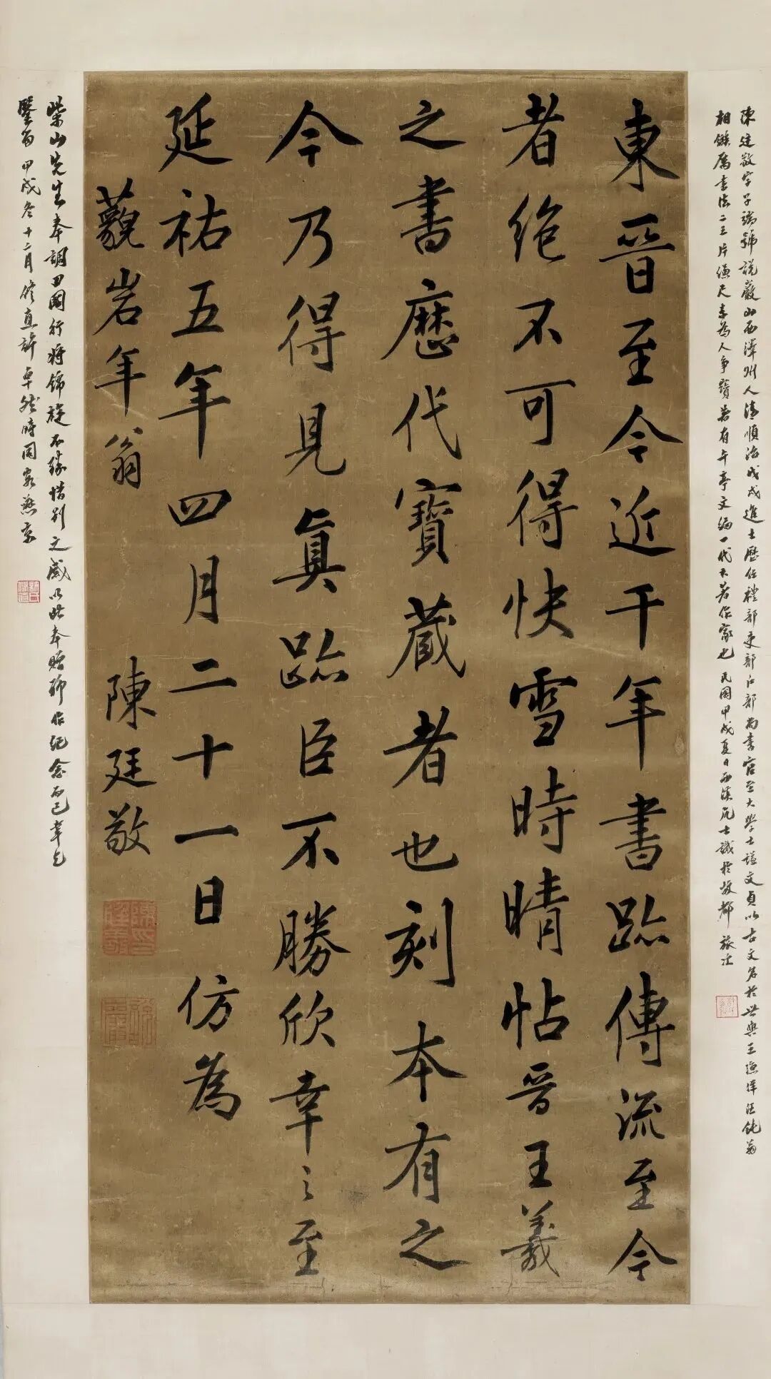 此轴为陈廷敬临仿赵孟頫题王羲之《快雪时晴帖》之跋文,此轴按宣和式裱工制式,双色花绫宽边大裱,材质华贵,在此次春拍中,被陈廷敬故里山西阳城皇城相府(陈廷敬故居)以74万元高价举回故里。唐、陈二作的物归其所,都印证了民间机构及企业对于企业文化的深度认知及重视。