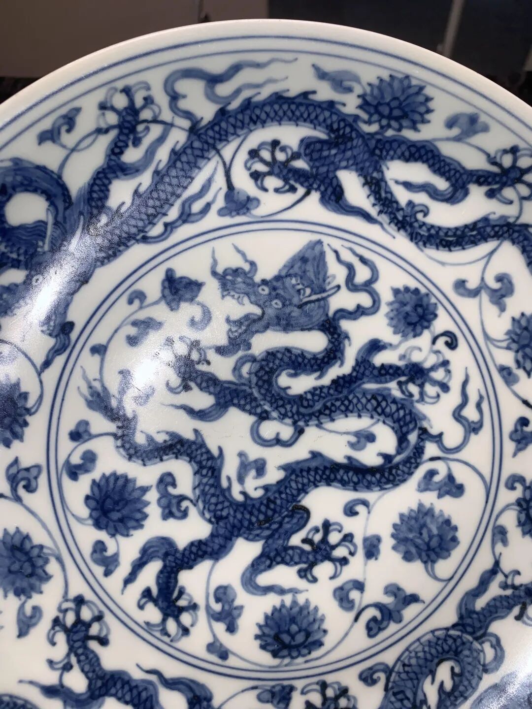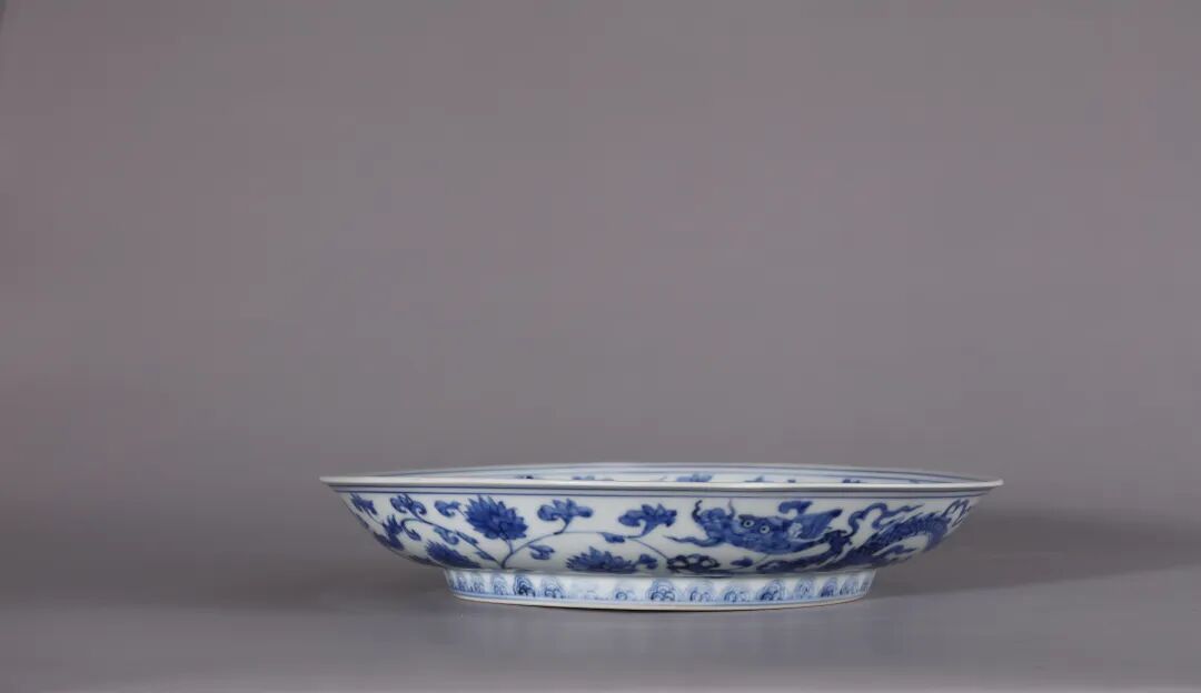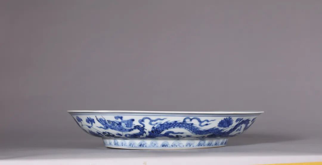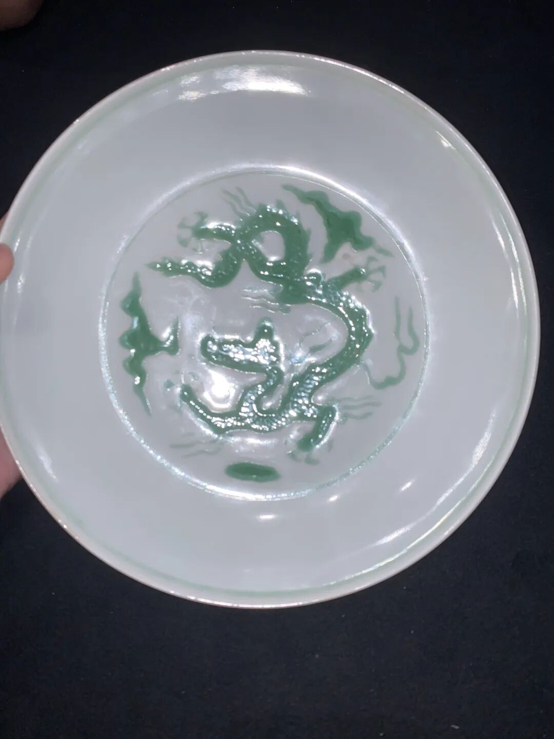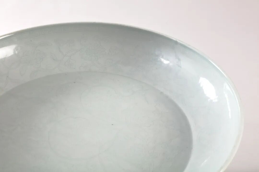 明宣德 霁青釉暗刻朵云行龙纹盘