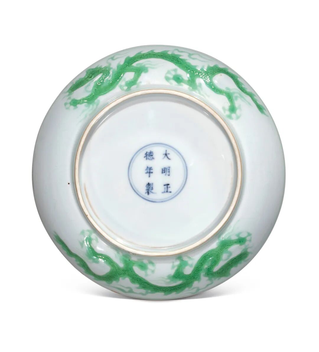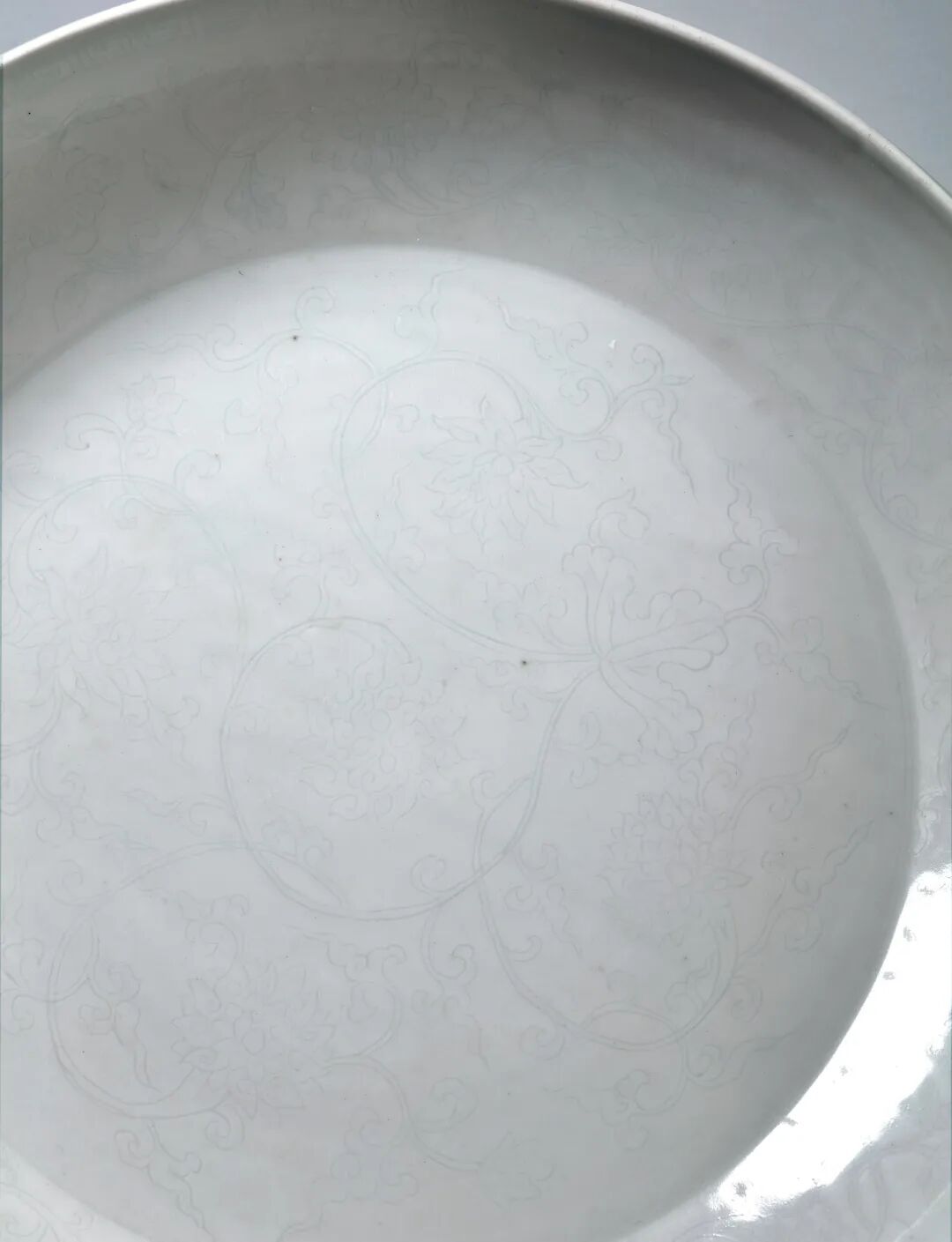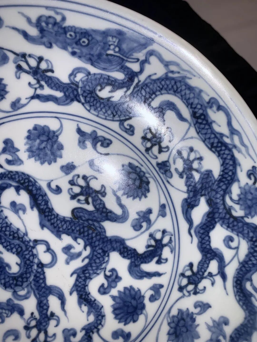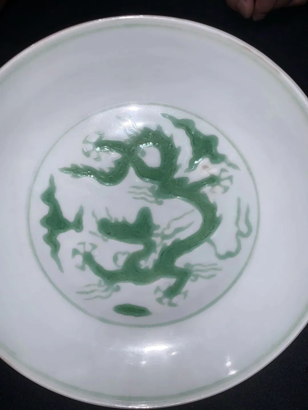 明宣德 霁青釉暗刻朵云行龙纹盘